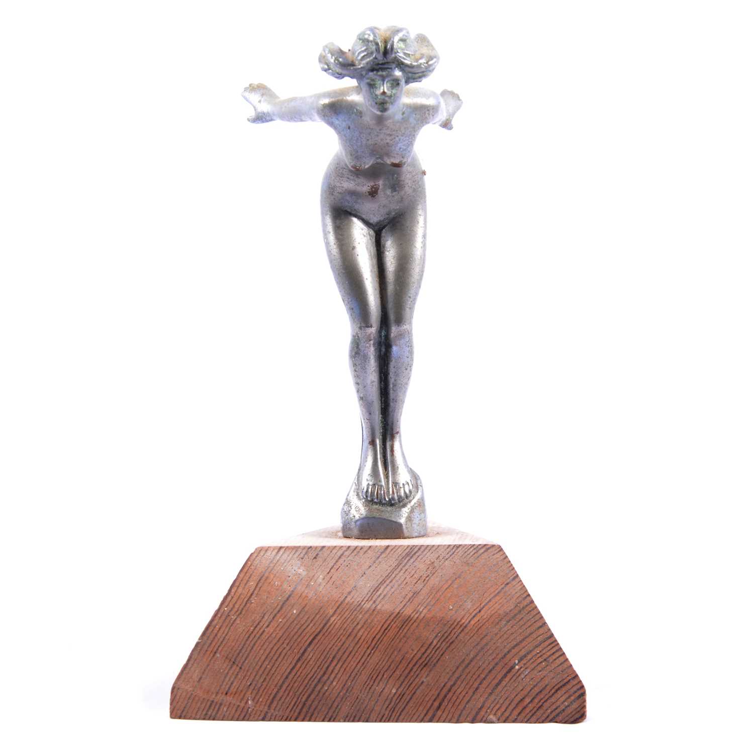 An Art Deco car mascot, female nude in diving position, on a shaped wooden base, overall height 17cm.