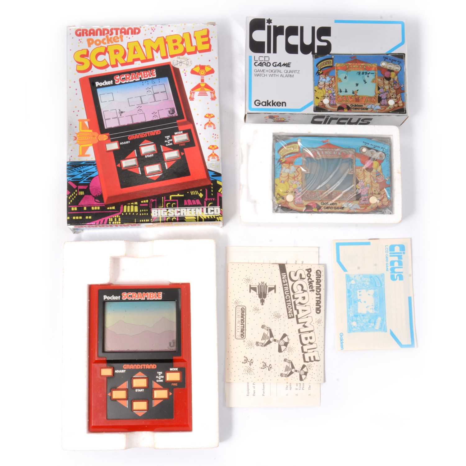 Two hand-held LCD games; Gakken Circus; Grandstand Pocket Scramble; both with inner packing and instructions.