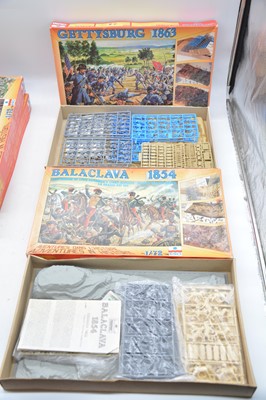 ESCI 1/72 scale model dioramas, eight including ref. 501 Isandhlwana; ref. 502 Waterloo 1815; ref. P-503 Balaclava 1854; ref. P-504 Gettysburg 1863; ref. P-505 Waterloo 1815 Cavalry and Artillery (x2); ref. P-512 Quatre Bras 1815, all boxed, all appear complete