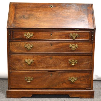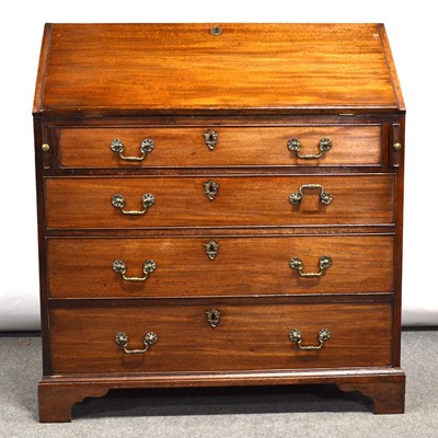 George III mahogany bureau, fall front, fitted interior, four long graduating drawers, bracket feet, width 93cm, depth 54cm, height 102cm.
