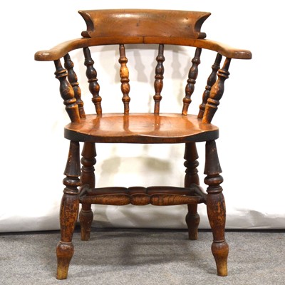 Smokers bow elbow chair, turned spindle back, turned legs and rails, width 68cm, height 81cm.