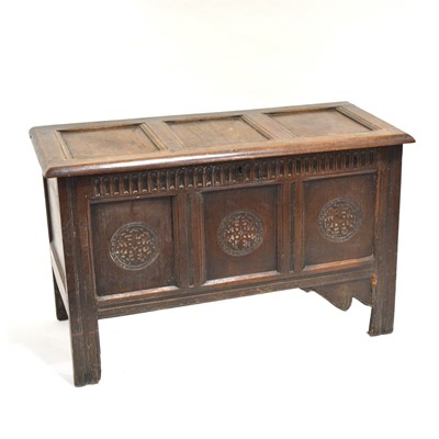 Joined oak coffer, 18th Century, hinged lid with three panels, carved three panel front, width 116cm, depth 52cm, height 72cm.