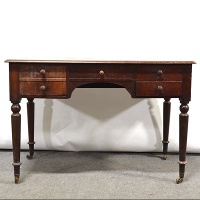 Victorian mahogany five-drawer writing table, rectangular top with moulded outline, turned tapering supports, raised on casters, width 110cm, depth ... read more