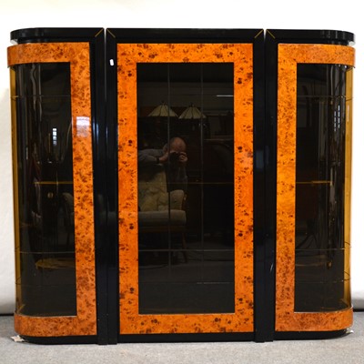 Contemporary Art Deco style black lacquered and burr walnut credenza, constructed in three sections, the central section with rectangular glazed door ... read more