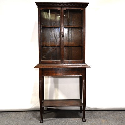 Edwardian oak display cabinet on stand, dentil cornice, two glazed doors enclosing teo shelves, the base with scrolled legs and an open shelf, width ... read more