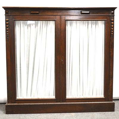 Oak bookcase, two glazed doors with cotton drapes, plinth base, width 122cm, depth 36cm, height 116cm.