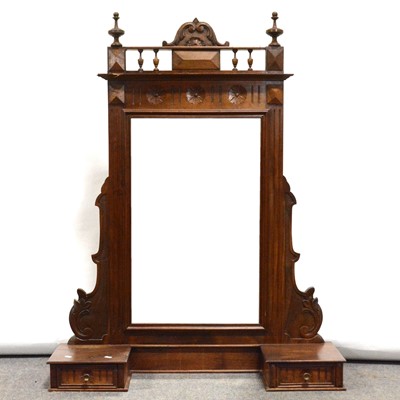 French walnut mirror dresser top, carved top rail with spindle gallery, bevelled rectangular plate, fitted with two trinket drawers to the base, ... read more