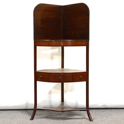Victorian mahogany corner washstand, high raised back, the undershelf with single drawer, above a further open shelf, depth 41cm, height 120cm.