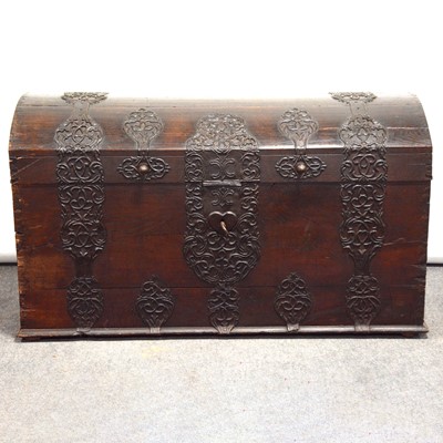 Large 18th century Marriage chest, domed three-plank top with pierced and scrolled ironwork strapping, stripped interior, further strapping and ... read more