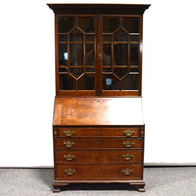 Georgian oak bureau bookcase, the top with cavetto and dentil cornice, glazed doors enclosing two adjustable shelves, base with fall front above four ... read more