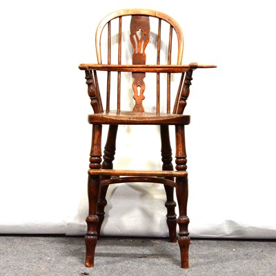 Elm and ash child's Windsor high-chair, turned legs, crinoline stretcher, width 51cm, height 92cm.