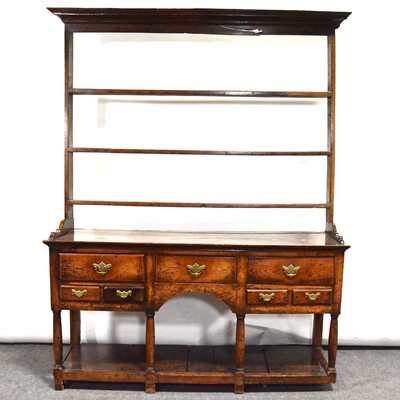 George III oak dresser, three shelf open delft rack, drawers under with pot board base, width 150cm, depth 44cm, height 196cm.