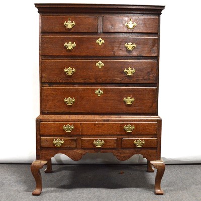 George III oak chest on stand, cavetto cornice, two short and three long graduating drawers, the stand with four drawers, shaped apron, cabriole legs, ... read more