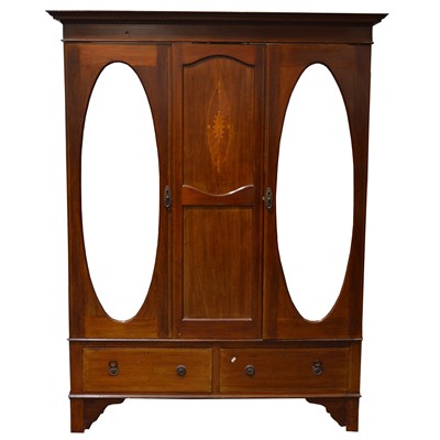 Edwardian inlaid mahogany triple wardrobe, two mirrored door with inlaid central panel, two drawers to the base, bracket feet, width 158cm, depth ... read more