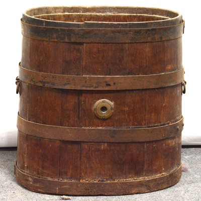 Oak Barrel / stick stand, oval patering form, four metal bands and two handles, height 55cm.