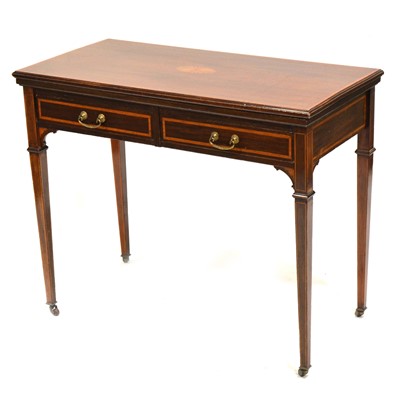 Edwardian inlaid mahogany card table, rectangular foldover top with baize interior, two frieze drawers, square tapering legs on brass casters, width ... read more