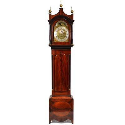 Scottish mahogany longcase clock, hood with arched top and ball finial, trunk with long door, bracket feet, twelve inch circular silvered dial with ... read more