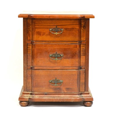 Pine bedside pedestal, with three drawer, bun feet, width 50cm, depth 41cm, height 62cm.
