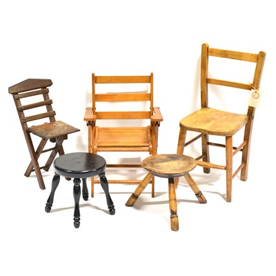 Small group of child's furniture, including three chairs and two stools. (Qty: 5)