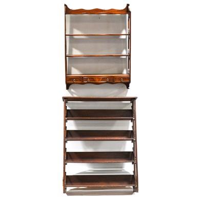 Set of mahogany wall shelves, drawer base, 91x69cm, and a set of oak wall shelves, 99x80cm. (Qty: 2)