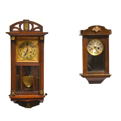 Continental wall clock, walnut case with metal mounts, the movement striking on a gong, 78cm, and a small American style wall clock. (Qty: 2)