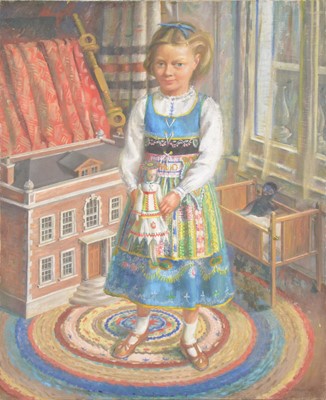 Leighton Hall Waoollatt, Portrait of a young girl, with doll, dolls house, etc., oil on canvas, signed, 92x71cm, unframed.