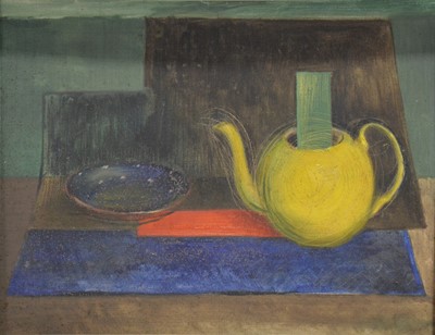 Leighton Hall Woollatt, Abstract with bust, oil on board, signed, 39x50cm, and Abstract still life with teapot, oil on board, unsigned, 36x45cm.