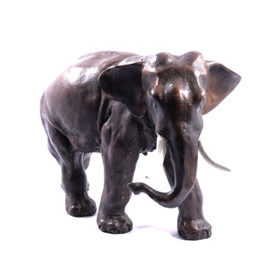 Modern composite sculpture of an elephant, patinated bronze-effect, painted tusks, height 24cm.