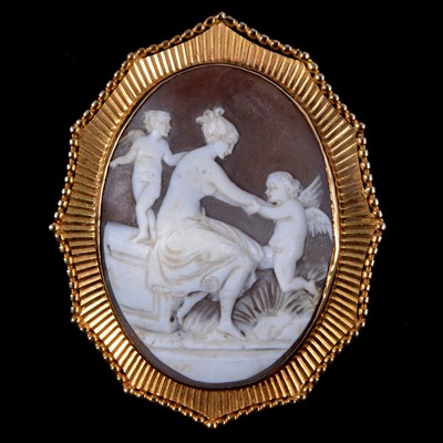 A carved shell cameo brooch, oval shell 45x35mm carved with classical lady in a garden with putti, wavy yellow metal mount, beaded outline, overall ... read more
