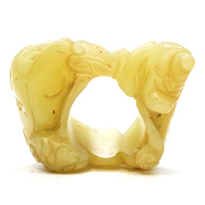 Chinese jade archers thumb ring, carved with a lion and ram, 5cm.
