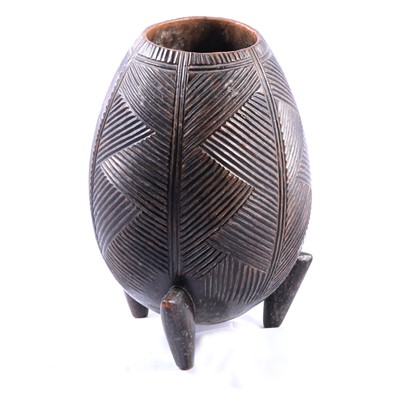 African carved tribal vase, strigulated decoration with vertical stripes, raised on three feet, 28.5cm. (Qty: 1)