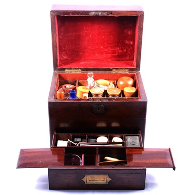 Late Georgian mahogany medicine chest, plain inlaid brass cartouche to hinged cover, revealing compartmentalised interior with a collection of (Qty: 3) ... read more