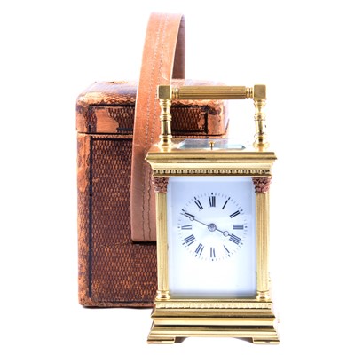 Brass carriage clock, the case with Corinthian columns, rectangular enamelled dial, repeating movement striking on a gong (not working), 14cm, in a ... read more