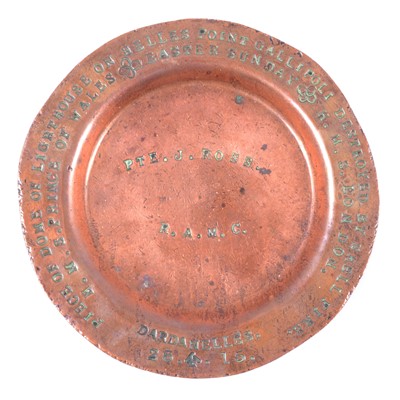 WW1 Gallipoli / Dardanelles interest - a copper ashtray inscribed "Piece of Dome of Lighthouse on Helles Point Gallipoli Destroyed by Shell Fire. HMS ... read more