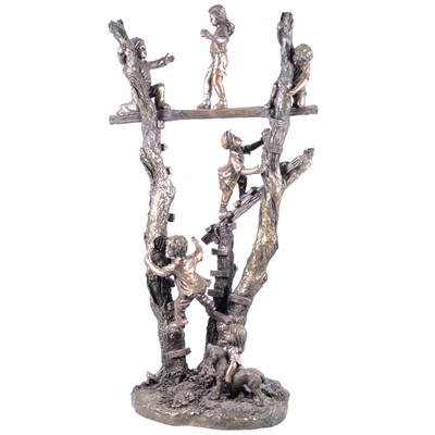 Cast and patinated resin group of Children at play, depicting six children assembling a tree house, on naturalistic base, stamped '2001 Crosa', 61cm.