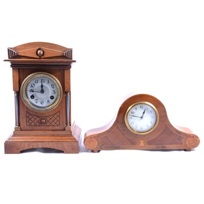 Edwardian mahogany and inlaid mantel clock, white circular dial with Arabic numerals, French cylinder movement, 34cm wide; and a German mantel clock, ... read more