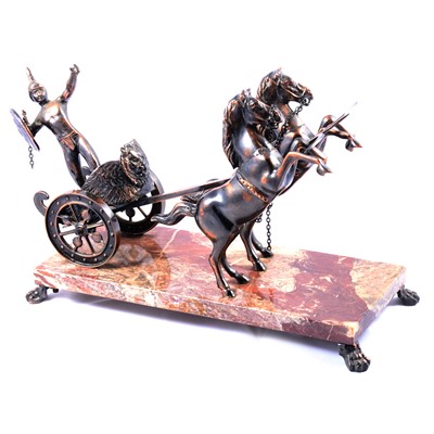 Patinated metal sculpture of a chariot with warrior, pulled by two rearing horses, mounted on rectangular marble base, raised on claw feet, width ... read more