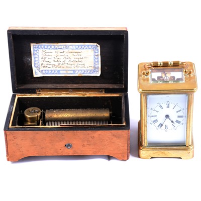 Maple cased Swiss musical box, 9.5cm drum playing six airs, 17cm wide; and a brass-cased carriage clock, 12.5cm high.