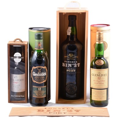 Two bottles of port and two bottles of single malt whisky: Fonseca Bin no 27 fine port, NV, magnum, in wooden case 1987 Royal Oporto, bottled for the (Qty: 4) ... read more