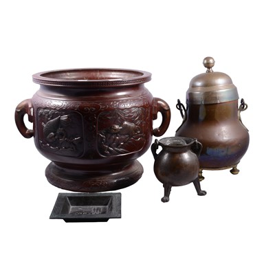 Large Japanese bronze jardiniere, elephant head handles, panelled decoration with animals, height 33cm; a small bronze tripod cauldron; a Dutch brass ... read more