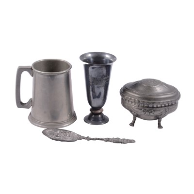 Small quantity of Dutch pewter and a small German brass stamp box, stamped 'Ges Gesch'.