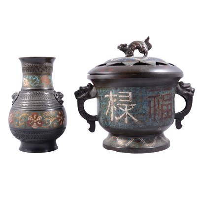 Chinese bronze and enamelled vase, pear form with pair of mask handles, geometric banding with cloisonne borders, 25cm; together with a similar large (Qty: 2) ... read more