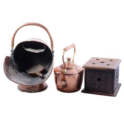 A pair of Marley Horses, 40cm, copper kettle, coal scuttle, brass fire irons, wooden church pew warmer, 19cm high etc.