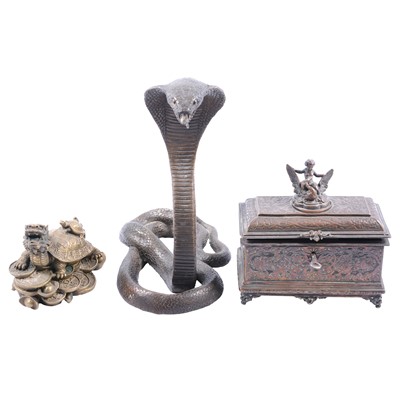 Model of a cobra, Chinese brass cash dragon, Leda and the Swan casket and a chair with Minton tile.