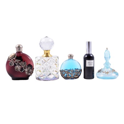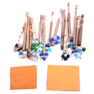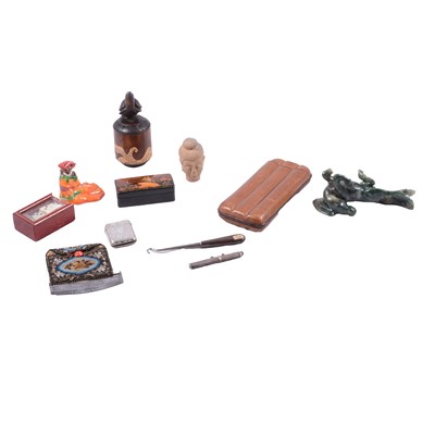 Small Russian box, probably Fedoskino; miniature bone-faced dominoes; silver vesta; bead work purse; silver-mounted match stand; leather cigar case ... read more