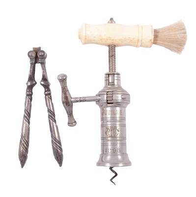 A rack and pinion corkscrew with brush and bone handle, pair of nutcrackers.
