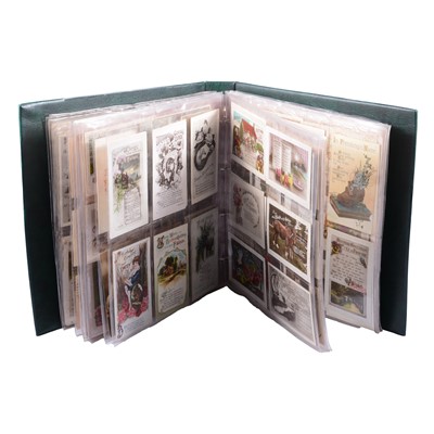 Two postcard albums - 511 mainly various greetings and sweethearts, children, a few embroidered, in modern albums with loose leaves each taking six ... read more