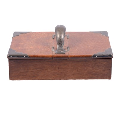Victorian oak and silver-mounted cigar case, hinged twin compartments, silver loop handle engraved with Gothic initials, hallmarked MW, London 1900, ... read more