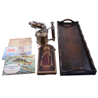 Collection of cigarette cards, an Edwardian mahogany and inlaid tray, another tray, Swedish Max Sievert 'No. 11 Vapouria' petrol blow torch lamp, etc
