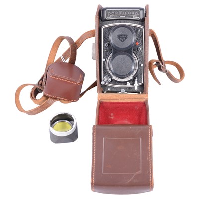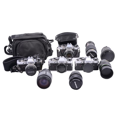 A Keystone K-12 Reflex Auto Zoom 8mm cine camera, with instruction manual, other paperwork, and leather carry case; Agfa 35mm camera; Halina 35mm (Qty: 5) ... read more
